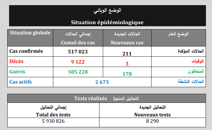 كوفيد-19: تسجيل 03 حالة وفاة و 211 إصابة جديدة و 178 حالة شفاء خلال الـ24 ساعة الماضية