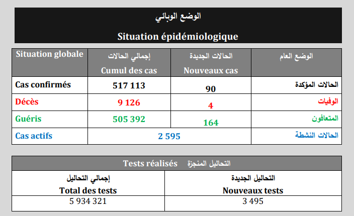 كوفيد-19: تسجيل 04 حالة وفاة و 90 إصابة جديدة و 164 حالة شفاء خلال الـ24 ساعة الماضية