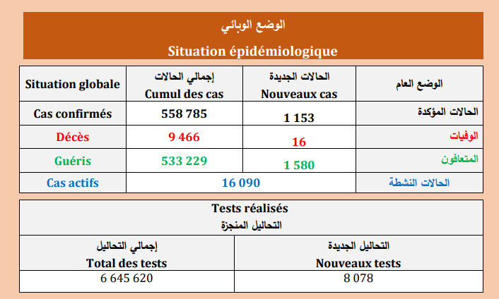 ارتفاع في عدد الوفيات بـ”كوفيد-19″: تسجيل 16 حالة وفاة و 1153 إصابة جديدة و 1580 حالة شفاء خلال الـ24 ساعة الماضية