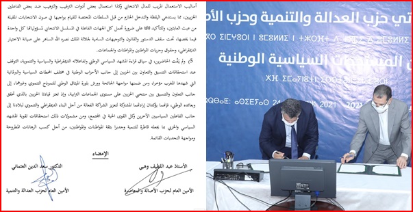 وفي الاخير تم التوقيع على اتفاقية التعاون والشراكة بين الحزبين، ومن مشمولها استحقاقات تقوية المشهد السياسي والحزبي لكسب ثقة المواطنات والمواطنين ، والرهانات المطروحة ، يقول البلاغ.