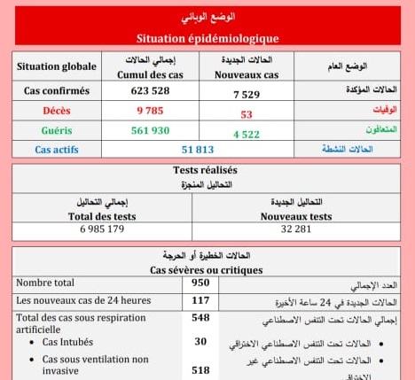 أعلنت وزارة الصحة، اليوم السبت ، عن تسجيل 7529 إصابة جديدة بكورونا المستجد و 4522 حالة شفاء و53 وفاة خلال ال24 ساعة الماضية.