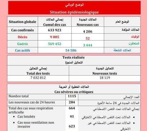 أعلنت وزارة الصحة، اليوم الإثنين، عن تسجيل 4206 إصابة جديدة بكورونا المستجد و 3444 حالة شفاء و52 وفاة خلال ال24 ساعة الماضية.