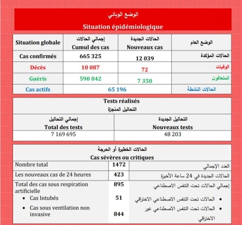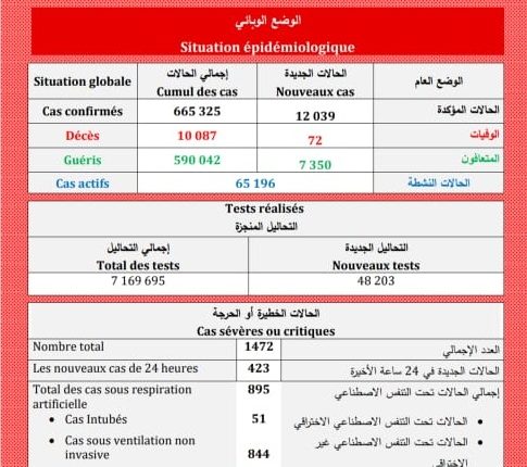 “كوفيد-19” يحصد الارواح .. والاصابات في تزائد مهول: 72 حالة وفاة و 12039 إصابة جديدة و 7350 حالة شفاء خلال الـ24 ساعة الماضية