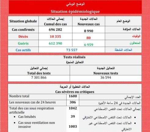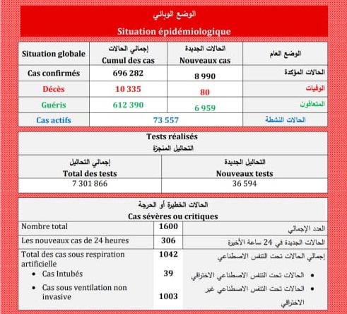 أعلنت وزارة الصحة، اليوم الأحد، عن تسجيل 8990 إصابة جديدة بكورونا المستجد و6959 حالة شفاء و80 وفاة خلال ال24 ساعة الماضية، فيما بلغ معدل ملء أسرة الإنعاش المخصصة ل”كوفيد-19″، 44.7 بالمائة.