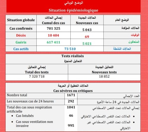أعلنت وزارة الصحة، اليوم الاثنين عن تسجيل 5 آلاف و43 إصابة جديدة بكورونا المستجد و5021 حالة شفاء و69 وفاة خلال ال24 ساعة الماضية.
