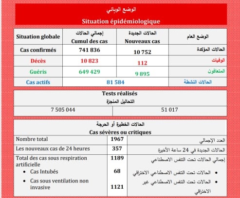 أعلنت وزارة الصحة، اليوم الجمعة، عن تسجيل 10 آلاف و 752 إصابة جديدة بكوفيد 19 و9895 حالة شفاء و 112 وفاة خلال ال24 ساعة الماضية، فيما بلغ معدل ملء أسرة الإنعاش المخصصة ل”كوفيد-19″، 46 بالمائة.