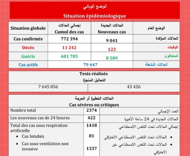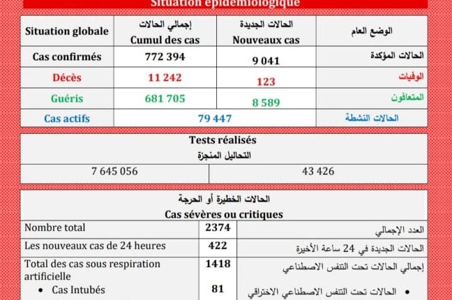 ارتفاع مهول في عدد الضحايا والمصابين بـ(كوفيد-19): 123 حالة وفاة و 9041 إصابة جديدة وشفاء 8589 حالة خلال ال24 ساعة الماضية