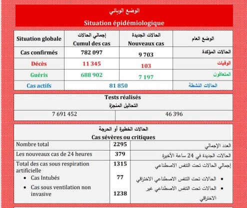 ارتفاع مهول في عدد الضحايا والمصابين بـ(كوفيد-19): 103 حالة وفاة و 9703 إصابة جديدة وشفاء 7197 حالة خلال ال24 ساعة الماضية