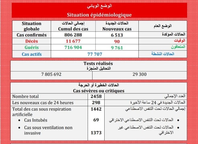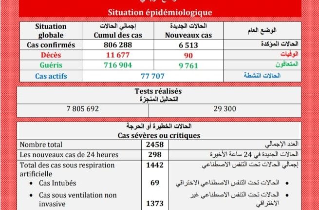 أعلنت وزارة الصحة، اليوم السبت ، عن تسجيل 6513 إصابة جديدة ب(كوفيد-19) و9761 حالة شفاء و90 وفاة خلال ال24 ساعة الماضية.