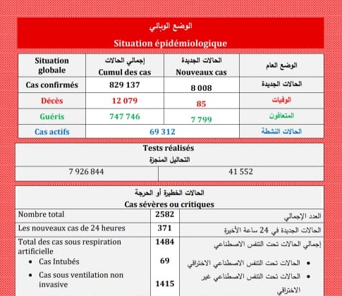 وبلغ عدد الحالات الخطيرة أو الحرجة الجديدة خلال الـ24 ساعة الأخيرة 371، لي.صل مجموع هذه الحالات إلى 2582، 1484 منها تحت التنفس الاصطناعي (69 تحت التنفس الاصطناعي الاختراقي و1415 تحت التنفس الاصطناعي غير الاختراقي).