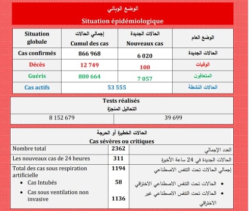وبلغ عدد الحالات الخطيرة أو الحرجة الجديدة خلال الـ24 ساعة الأخيرة 311، ليصل مجموع هذه الحالات إلى 2362، 1236 منها تحت التنفس الاصطناعي (58 تحت التنفس الاصطناعي الاختراقي و1136 تحت التنفس الاصطناعي غير الاختراقي).