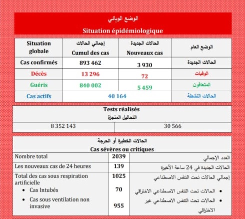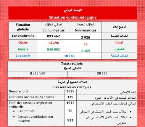 كوفيد-19: تسجيل 72 حالة وفاة واصابة 3930 و شفاء 5459 خلال 24 ساعة