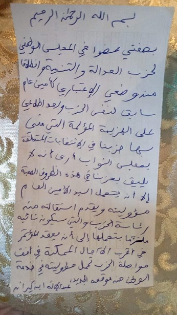 وقال ابن كيران في ذات “الورقة” رفقته :“بصفتي عضواً في المجلس الوطني لحزب العدالة والتنمية ٬ وانطلاقاً منذ وضعي الاعتباري كأمين عام سابق لنفس الحزب، وبعد اطلاعي على الهزيمة المؤلمة التي مُني بها حزبنا في الانتخابات المتعلقة بمجلس النواب،  أرى أنه لا يليق بحزبنا في هذه الظروف الصعبة ٬ إلا أن يتحمل السيد الأمين العام مسؤوليته ويقدم استقالته من رئاسة الحزب ٬والتي سيكون نائبه ملزما بتحملها إلى أن يعقد المؤتمر في أقرب الآجال الممكنة في أفق مواصلة الحزب تحمل مسؤوليته في خدمة الوطن من موقعه الجديد”.