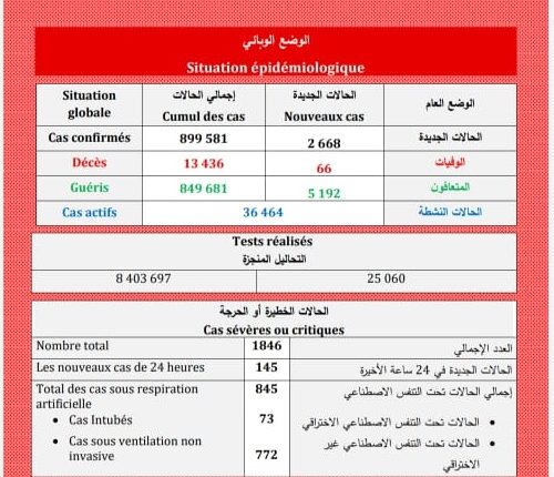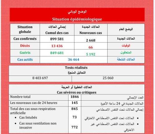 (كوفيد-19): تسجيل 66 حالة وفاة و اصابة 2668 مع شفاء 5192 حلالة خلال 24 ساعة