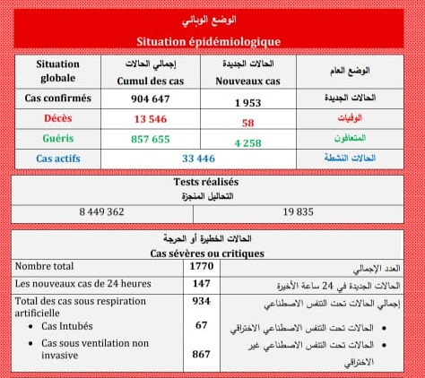 ورفعت الحصيلة الجديدة للإصابات بالفيروس العدد الإجمالي لحالات الإصابة المؤكدة بالمملكة إلى 904 ألف و647 حالة منذ الإعلان عن أول حالة في 2 مارس 2020، فيما بلغ مجموع حالات الشفاء التام 857 ألف و655 ألف بنسبة تعاف تبلغ 94,8 في المائة، بينما ارتفع عدد الوفيات إلى 13 ألف و546 وفاة بنسبة فتك قدرها 1,5 في المائة.