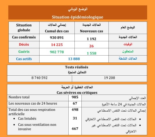 ورفعت الحصيلة الجديدة للإصابات بالفيروس العدد الإجمالي لحالات الإصابة المؤكدة بالمملكة إلى930 ألف و 891 حالة منذ الإعلان عن أول حالة في 2 مارس 2020، فيما بلغ مجموع حالات الشفاء التام 902 ألف و 778 بنسبة تعاف تبلغ 97 في المائة، بينما ارتفع عدد الوفيات إلى 14 ألف و 225 حالة، بنسبة فتك قدرها 1.5 في المائة. وتتوزع حالات الإصابة المسجلة خلال الـ24 ساعة الأخيرة عبر جهات المملكة، بين الرباط-سلا-القنيطرة (302)، والدار البيضاء-سطات (527)، والشرق (90)، والداخلة-وادي الذهب (22)، وطنجة-تطوان-الحسيمة (98)، وبني ملال-خنيفرة (37)، ومراكش-آسفي (33)، وسوس-ماسة (6)، وفاس-مكناس (39)، ودرعة-تافيلالت (12)، والعيون-الساقية الحمراء (16) وكلميم واد نون (10) . وتم تسجيل الوفيات الجديدة في جهات الرباط-سلا-القنيطرة (6)، والدار البيضاء-سطات (5)، والشرق (2)، وطنجة-تطوان-الحسيمة (3)، ومراكش-آسفي (3)، وفاس-مكناس (2) والعيون-الساقية الحمراء (2) وبني ملال-خنيفرة (1) وكلميم واد نون (1) وسوس-ماسة (1). وبحسب النشرة، فقد أصبح مؤشر الإصابة التراكمي بالمغرب يبلغ 2548.2 إصابة لكل مائة ألف نسمة، بمؤشر إصابة يبلغ 3.2 لكل مائة ألف نسمة خلال الـ24 ساعة الماضية، فيما يصل مجموع الحالات النشطة 13 ألف و888 حالة. وبلغ عدد الحالات الخطيرة أو الحرجة الجديدة، 67 حالة خلال الـ24 ساعة الأخيرة، ليصل مجموع هذه الحالات إلى 985 حالة، منها 498 تحت التنفس الاصطناعي (31 حالة تحت التنفس الاصطناعي الاختراقي و 467 تحت التنفس الاصطناعي غير الاختراقي).