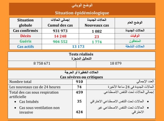 وبلغ عدد الحالات الخطيرة أو الحرجة الجديدة، 74 حالة خلال الـ24 ساعة الأخيرة، ليصل مجموع هذه الحالات إلى 910 حالة، منها 459 تحت التنفس الاصطناعي (35 حالة تحت التنفس الاصطناعي الاختراقي و424 تحت التنفس الاصطناعي غير الاختراقي).