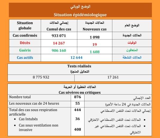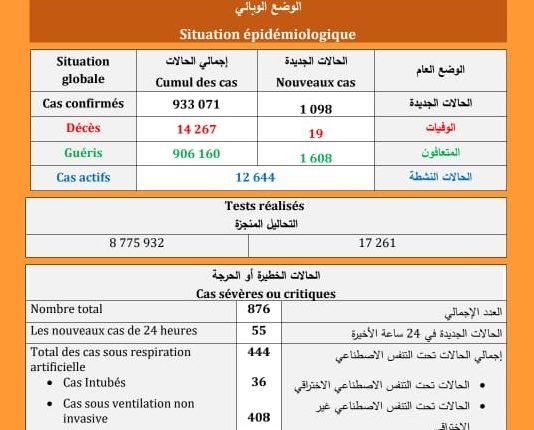 “كوفيد-19”: تسجيل 19 حالة وفاة و 1098 إصابة جديدة 1608 حالة شفاء.. وأزيد من 19 مليون و69 ألف ملقح بالكامل