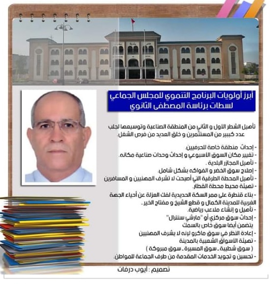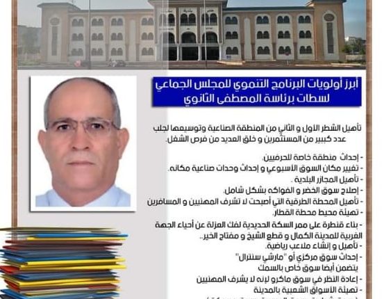 واستنادا إلى نفس المصادر،فإن العديد من أعضاء المكتب المسير،خاصة الفريق التجمعي أكدو للجريدة، على أن باب الجماعة سيبقى مفتوحا في وجه الجميع بدون اسثتناء للتفاعل مع الشكايات والطلبات بالسرعة والنجاعة المطلوبتين،إلى جانب تجويد الخدمات بفتح حوار موسع مع كل الفئات المعنية في إطار مقاربات ومبادرات تشاركية لتحقيق هدف تنمية الاحياء،وخاصة الهامشية منها،وكذا تشجيع جلب الاسثتمارات ومواكبة المستثمرين وإحياء المنطقة الصناعية الراكدة لسنوات طويلة.ومن جهة أخرى يراهن “المصطفى الثانوي” من خلال برنامج انتخابي قدمه على صفحته الفيسبوكية،على تحقيق إصلاح تنموي شامل في كل المناحي الاقتصادية والاجتماعية بإحدات منطقة خاصة بالحرفيين وبالصناع،وإصلاح الاسواق و تأجيلها وتغيير مكان بعضها للضرورة،وإحداث أخرى عصرية، مع تأهيل المحطة الطرقية ومحيط محطة الفطار، وكدا تجويد كل الخدمات التي بحتاجها المواطن…هذا البرنامج الذي اختار له الرئيس الجديد للبلدية شعار حزب الاستقلال،”الانصاف الان” من أجل تجاوز الفترة الحالية المأزومة وتسريع وتيرة النمو والحركة الاقتصادي لعاصمة الشاوية بلغة نفس المصادر.