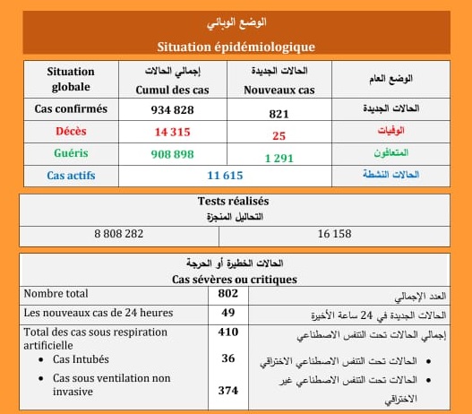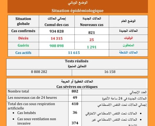 (كوفيد-19) : تسجيل 25 حالة وفاة و 821 إصابة جديدة و1291 حالة شفاء خلال الـ 24 ساعة الماضية