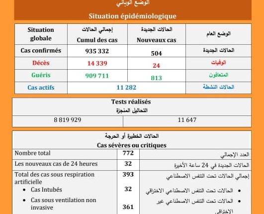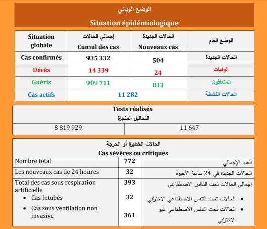 وبلغ عدد الحالات الخطيرة أو الحرجة الجديدة، 32 حالة خلال الـ24 ساعة الأخيرة، ليصل مجموع هذه الحالات إلى 772 حالة، منها 393 تحت التنفس الاصطناعي (32 حالة تحت التنفس الاصطناعي الاختراقي و361 تحت التنفس الاصطناعي غير الاختراقي).