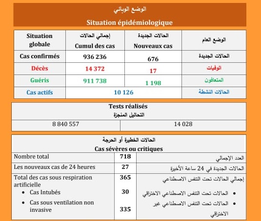 (كوفيد-19) : تسجيل 17 حالة وفاة و 676 إصابة جديدة و1198 حالة شفاء خلال الـ 24 ساعة الماضية
