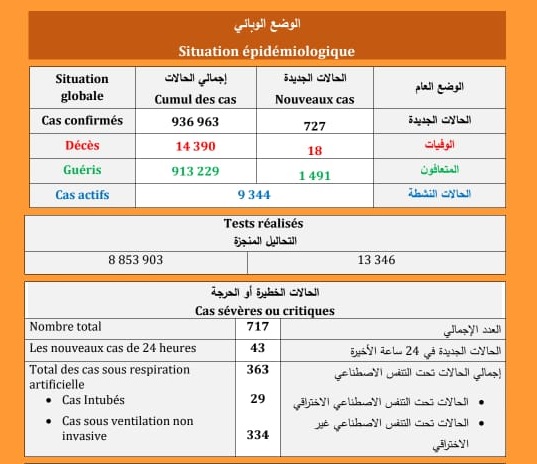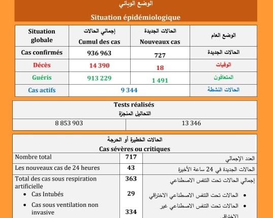 (كوفيد-19) : تسجيل 19 حالة وفاة و727 اصابة جديدة و 1491 حالة شفاء و أزيد من 64 ألف شخصا تلقوا الجرعة الثالثة من اللقاح