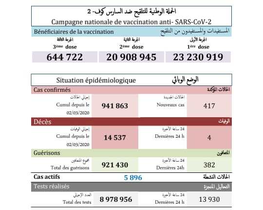 وتم تسجيل الوفيات الجديدة في جهتي الدار البيضاء-سطات (3)، وفاس-مكناس (1). وبحسب النشرة، فقد أصبح مؤشر الإصابة التراكمي بالمغرب يبلغ 2578 إصابة لكل مائة ألف نسمة، بمؤشر إصابة يبلغ 1.1 لكل مائة ألف نسمة خلال الـ24 ساعة الماضية، فيما يصل مجموع الحالات النشطة إلى 5896 حالة.