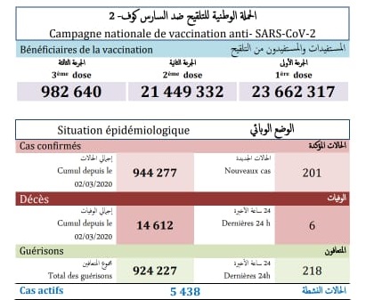 ورفعت الحصيلة الجديدة للإصابات بالفيروس العدد الإجمالي لحالات الإصابة المؤكدة بالمملكة إلى 944 ألف و 277 حالة منذ الإعلان عن أول حالة في 2 مارس 2020، فيما بلغ مجموع حالات الشفاء التام 924 ألف و 227 حالة بنسبة تعاف تبلغ 97.9 في المائة، بينما ارتفع عدد الوفيات إلى 14 ألف 612 حالة، بنسبة فتك قدرها 1.5 في المائة.