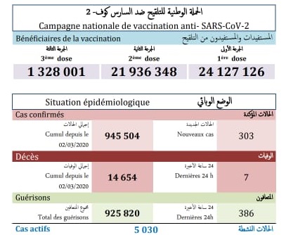 وأبرزت الوزارة في النشرة اليومية لنتائج (كوفيد-19)، من جهة أخرى، أنه تم تسجيل 303 إصابات جديدة ب (كوفيد-19)، و 386 حالة شفاء، و 7 وفيات خلال الـ24 ساعة الماضية.
