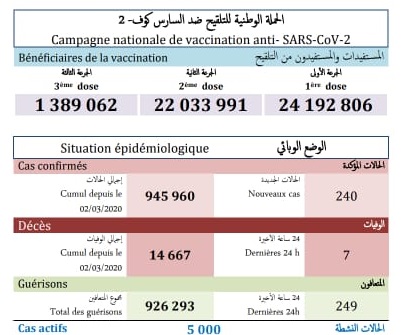 وأبرزت الوزارة في النشرة اليومية لنتائج (كوفيد-19)، من جهة أخرى، أنه تم تسجيل 240 إصابة جديدة ب (كوفيد-19)، و249 حالة شفاء، و7 وفيات خلال الـ24 ساعة الماضية.