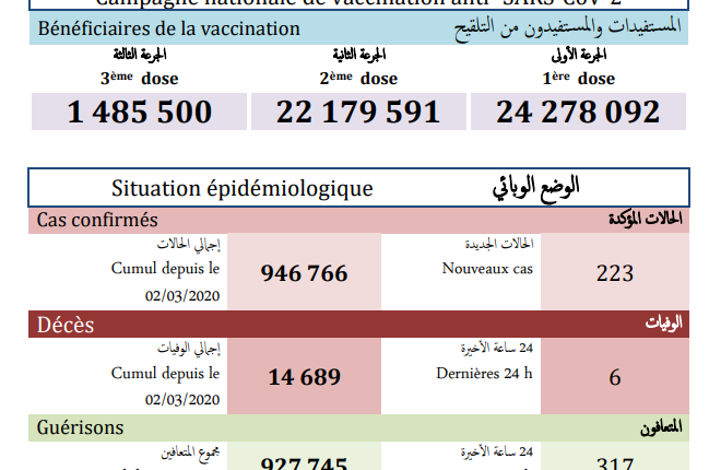 ورفعت الحصيلة الجديدة للإصابات بالفيروس العدد الإجمالي لحالات الإصابة المؤكدة بالمملكة إلى 946 ألف و766 حالة منذ الإعلان عن أول حالة في 2 مارس 2020، فيما بلغ مجموع حالات الشفاء التام 927 ألف و745 حالة بنسبة تعاف تبلغ 98 في المائة، بينما ارتفع عدد الوفيات إلى 14 ألف و689 حالة وبنسبة فتك قدرها 1.6 في المائة.