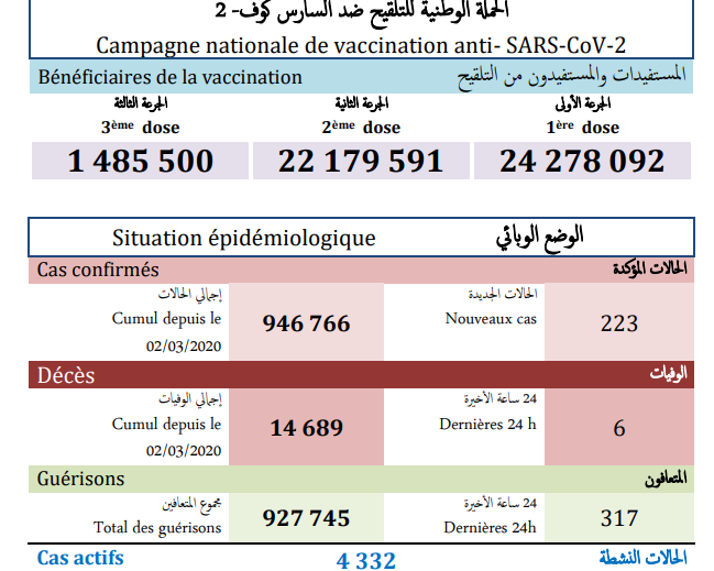 وأبرزت الوزارة في النشرة اليومية لنتائج (كوفيد-19)، من جهة أخرى، أنه تم تسجيل 223 إصابة جديدة ب (كوفيد-19)، و317 حالة شفاء، و6 وفيات خلال الـ24 ساعة الماضية.
