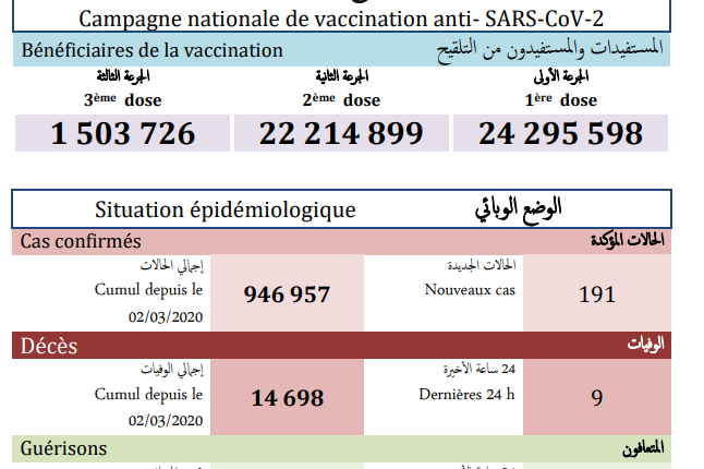 وأبرزت الوزارة في النشرة اليومية لنتائج (كوفيد-19)، من جهة أخرى، أنه تم تسجيل 191 إصابة جديدة ب (كوفيد-19)، و211 حالة شفاء، و9 وفيات خلال الـ24 ساعة الماضية.