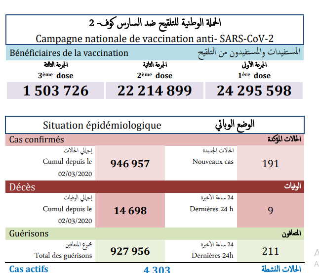 ورفعت الحصيلة الجديدة للإصابات بالفيروس العدد الإجمالي لحالات الإصابة المؤكدة بالمملكة إلى 946 ألف و957 حالة منذ الإعلان عن أول حالة في 2 مارس 2020، فيما بلغ مجموع حالات الشفاء التام 927 ألف و956 حالة بنسبة تعاف تبلغ 98 في المائة، بينما ارتفع عدد الوفيات إلى 14 ألف و698 حالة وبنسبة فتك قدرها 1.6 في المائة.
