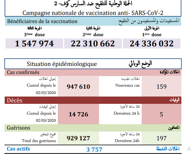 وأبرزت الوزارة في النشرة اليومية لنتائج (كوفيد-19)، من جهة أخرى، أنه تم تسجيل 159 إصابة جديدة ب (كوفيد-19)، و197 حالة شفاء، و5 وفيات خلال الـ24 ساعة الماضية.