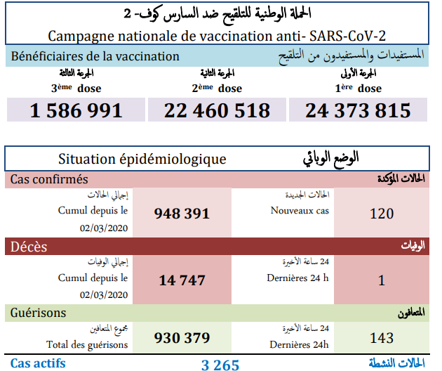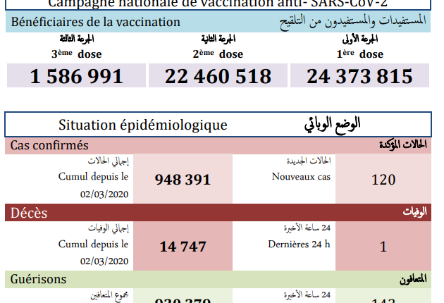 وأشارت النشرة الى أن الحصيلة الجديدة للإصابات بالفيروس رفعت العدد الإجمالي لحالات الإصابة المؤكدة بالمملكة إلى 948 ألف و 391 حالة منذ الإعلان عن أول حالة في 2 مارس 2020، فيما بلغ مجموع حالات الشفاء التام 930 ألف و 379 حالة بنسبة تعاف تبلغ 98.1 في المائة، بينما ارتفع عدد الوفيات إلى 14 ألف و747 حالة بنسبة فتك قدرها 1.6 في المائة بتسجيل حالة وفاة واحدة جديدة في جهة كلميم واد نون.