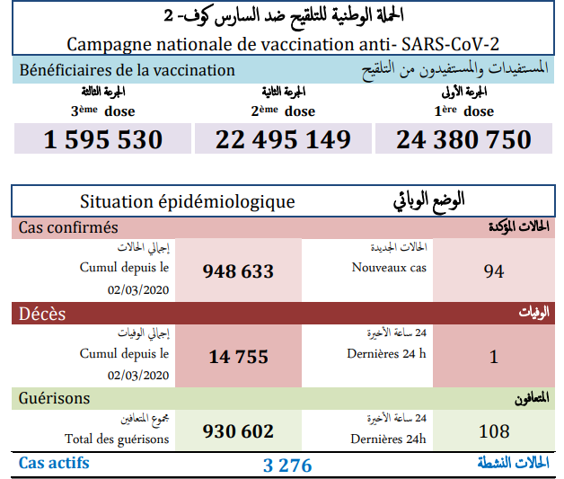 وأشارت النشرة الى أن الحصيلة الجديدة للإصابات بالفيروس رفعت العدد الإجمالي لحالات الإصابة المؤكدة بالمملكة إلى 948 ألف و633 حالة منذ الإعلان عن أول حالة في 2 مارس 2020، فيما بلغ مجموع حالات الشفاء التام 930 ألف و602 حالة بنسبة تعاف تبلغ 98.1 في المائة، بينما ارتفع عدد الوفيات إلى 14 ألف و755 حالة بنسبة فتك قدرها 1.6 في المائة.