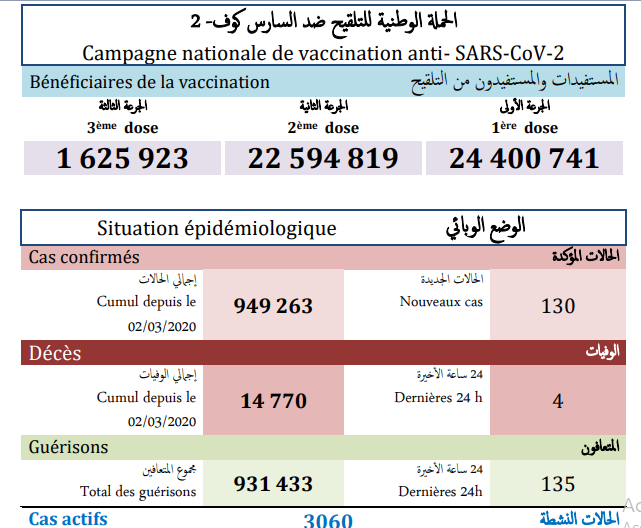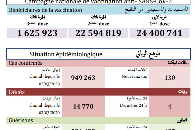 أعلنت وزارة الصحة والحماية الاجتماعية ، اليوم الاربعاء ، أنه تم تسجيل 130 إصابة جديدة بفيروس (كوفيد-19)، و 135 حالة شفاء و 4 حالات وفاة خلال ال24 ساعة الماضية. وأبرزت الوزارة في النشرة اليومية لحصيلة (كوفيد-19)، أن مليون و 625 ألف و 923 شخصا تلقوا الجرعة الثالثة من اللقاح المضاد للفيروس، فيما ارتفع عدد الملقحين بالجرعة الثانية إلى 22 مليون و 594 ألف و 819 شخصا، مقابل 24 مليون و 400 ألف و741 شخصا تلقوا الجرعة الأولى. وأشارت النشرة الى أن الحصيلة الجديدة للإصابات بالفيروس رفعت العدد الإجمالي لحالات الإصابة المؤكدة بالمملكة إلى 949 ألف و263 حالة منذ الإعلان عن أول حالة في 2 مارس 2020، فيما بلغ مجموع حالات الشفاء التام 931 ألف و 433 حالة بنسبة تعاف تبلغ 98.1 في المائة، بينما ارتفع عدد الوفيات إلى 14 ألف و 770 حالة بنسبة فتك قدرها 1.6 في المائة بتسجيل 4 حالات في جهات الدار البيضاء-سطات والرباط-سلا-القنيطرة وطنجة-تطوان-الحسيمة و الداخلة وادي الذهب.