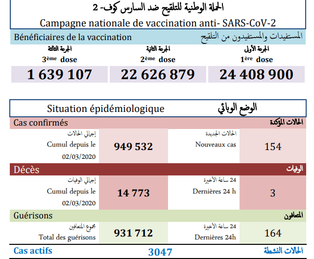 وأشارت النشرة الى أن الحصيلة الجديدة للإصابات بالفيروس رفعت العدد الإجمالي لحالات الإصابة المؤكدة بالمملكة إلى 949 ألف و 532 حالة منذ الإعلان عن أول حالة في 2 مارس 2020، فيما بلغ مجموع حالات الشفاء التام 931 ألف و 712 حالة بنسبة تعاف تبلغ 98.1 في المائة، بينما استقر عدد الوفيات عند 14 ألف و 773 حالة بنسبة فتك قدرها 1.6 في المائة، مع تسجيل 3 وفيات جديدة في كل من جهات الرباط-سلا-القنيطرة وبني ملال-خنيفرة وسوس ماسة.