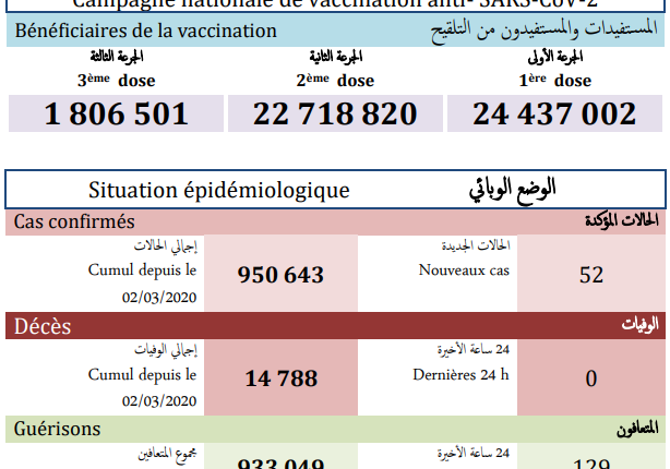 وأشارت النشرة إلى أن الحصيلة الجديدة للإصابات بالفيروس رفعت العدد الإجمالي لحالات الإصابة المؤكدة بالمملكة إلى 950 ألف و 643 حالة منذ الإعلان عن أول حالة في 2 مارس 2020، فيما بلغ مجموع حالات الشفاء التام 933 ألف و49 حالة بنسبة تعاف تبلغ 98.1 في المائة، فيما استقر عدد الوفيات في حدود 14 ألف و788 بنسبة فتك تصل الى 1.6 في المائة.