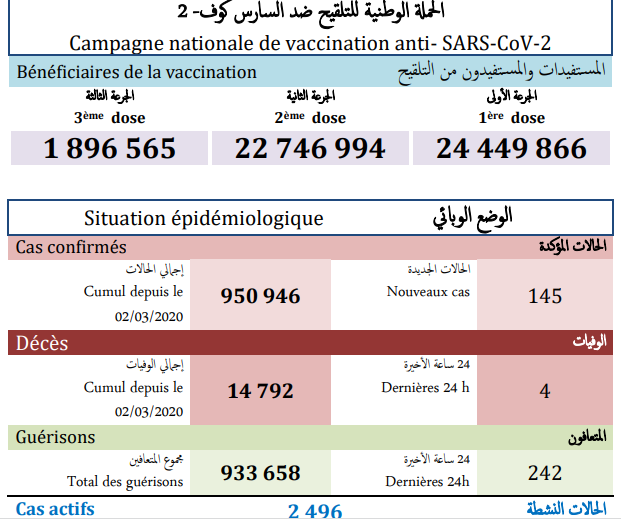 وأبرزت الوزارة في النشرة اليومية لحصيلة (كوفيد-19)، أن مليون و934 ألف و 837 شخصا تلقوا الجرعة الثالثة من اللقاح المضاد للفيروس، فيما ارتفع عدد الملقحين بالجرعة الثانية إلى 22 مليون و 759 ألف و148 شخصا، مقابل 24 مليون و456 ألف و314 تلقوا الجرعة الأولى. وأشارت النشرة إلى أن الحصيلة الجديدة للإصابات بالفيروس رفعت العدد الإجمالي لحالات الإصابة المؤكدة بالمملكة إلى 951 ألف و 92 حالة منذ الإعلان عن أول حالة في 2 مارس 2020، فيما بلغ مجموع حالات الشفاء التام 934 ألف و 9 حالات بنسبة تعاف تبلغ 98.2 في المائة، فيما استقر عدد الوفيات في حدود 14 ألف و794 بنسبة فتك تصل الى 1.6 في المائة.