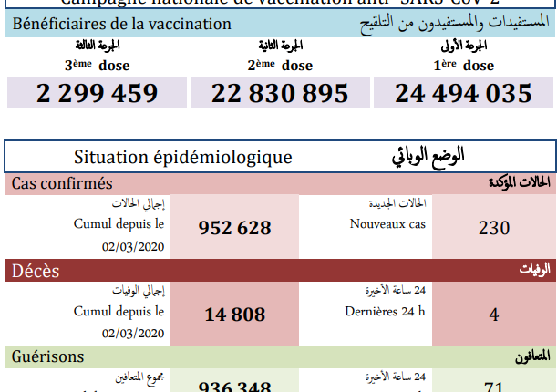 وأشارت النشرة إلى أن الحصيلة الجديدة للإصابات بالفيروس رفعت العدد الإجمالي لحالات الإصابة المؤكدة بالمملكة إلى 952 ألف و628 حالة منذ الإعلان عن أول حالة في 2 مارس 2020، فيما بلغ مجموع حالات الشفاء التام 936 ألف و348 حالة بنسبة تعاف تبلغ 98.3 في المائة، فيما استقر عدد الوفيات في حدود 14 ألف و808 بنسبة فتك تصل الى 1.6 في المائة.