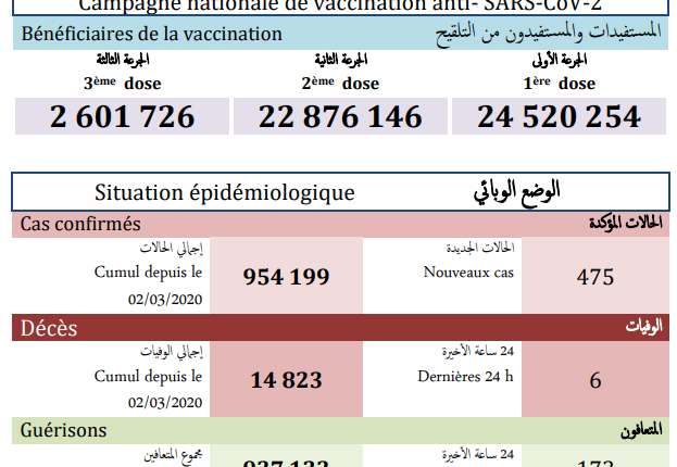 وأشارت النشرة إلى أن الحصيلة الجديدة للإصابات بالفيروس رفعت العدد الإجمالي لحالات الإصابة المؤكدة بالمملكة إلى 954 ألف و199 حالة منذ الإعلان عن أول حالة في 2 مارس 2020، فيما بلغ مجموع حالات الشفاء التام 937 ألف و133 حالة بنسبة تعاف تبلغ 98.2 في المائة، فيما بلغ عدد الوفيات 14 ألف و823 بنسبة فتك تصل الى 1.6 في المائة.