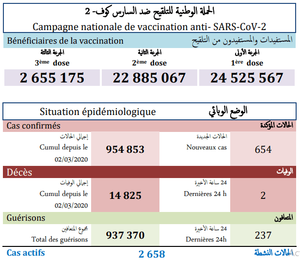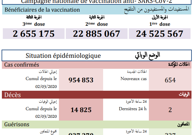 وأشارت النشرة إلى أن الحصيلة الجديدة للإصابات بالفيروس رفعت العدد الإجمالي لحالات الإصابة المؤكدة بالمملكة إلى 954 ألف و 853 حالة منذ الإعلان عن أول حالة في 2 مارس 2020، فيما بلغ مجموع حالات الشفاء التام 937 ألف و 370 حالة بنسبة تعاف تبلغ 98.2 في المائة، فيما بلغ عدد الوفيات 14 ألف و825 بنسبة فتك تصل الى 1.6 في المائة.
