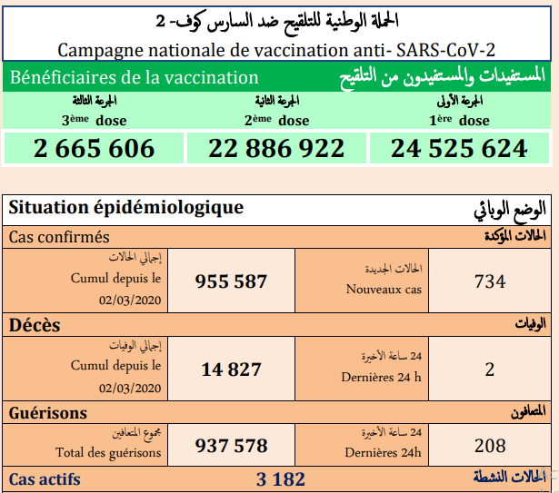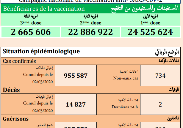 وأشارت النشرة إلى أن الحصيلة الجديدة للإصابات بالفيروس رفعت العدد الإجمالي لحالات الإصابة المؤكدة بالمملكة إلى 955 ألف و587 حالة منذ الإعلان عن أول حالة في 2 مارس 2020، فيما بلغ مجموع حالات الشفاء التام 937 ألف و578 حالة بنسبة تعاف تبلغ 1، 98 في المائة، فيما بلغ عدد الوفيات 14 ألف و827 بنسبة فتك تصل الى 1.6 في المائة.
