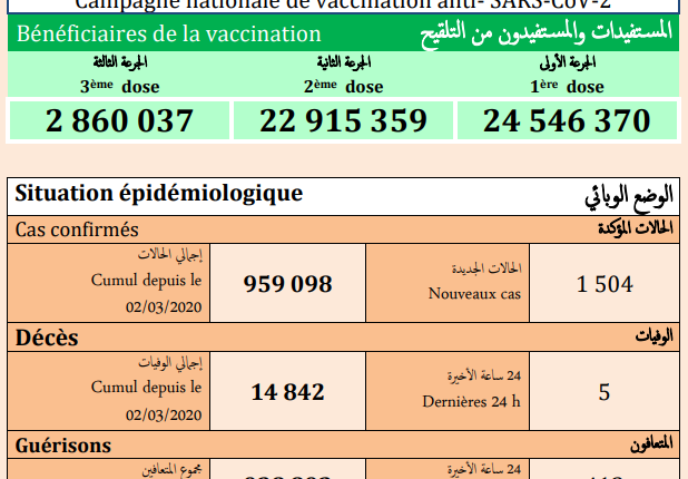 وأشارت النشرة إلى أن الحصيلة الجديدة للإصابات بالفيروس رفعت العدد الإجمالي لحالات الإصابة المؤكدة بالمملكة إلى 959 ألف و98 حالة منذ الإعلان عن أول حالة في 2 مارس 2020، فيما بلغ مجموع حالات الشفاء التام 938 ألف و892 حالة بنسبة تعاف تبلغ 97.9 في المائة، فيما بلغ عدد الوفيات 14 ألف و842 بنسبة فتك تصل الى 1.5 في المائة.