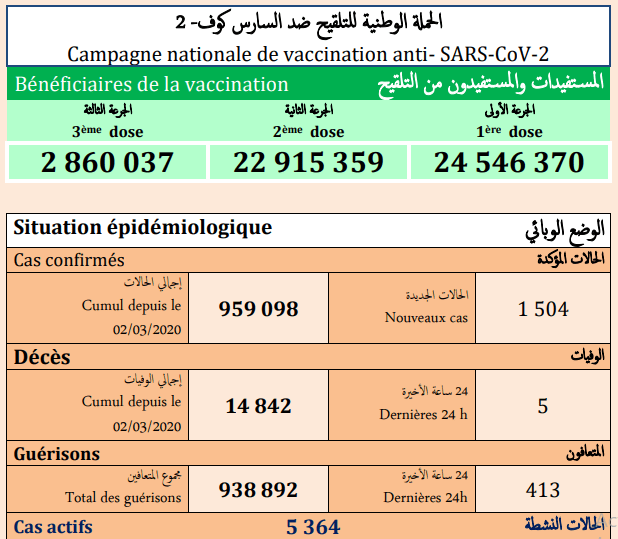 سجيل “خمس وفيات” و 1504 إصابات جديدة بفيروس (كوفيد-19) فيما بلغ عدد المتعافين 413 شخصا خلال الـ24 ساعة الماضية.
