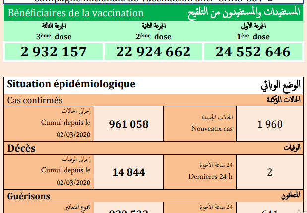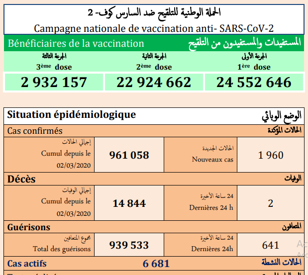 وأشارت النشرة إلى أن الحصيلة الجديدة للإصابات بالفيروس رفعت العدد الإجمالي لحالات الإصابة المؤكدة بالمملكة إلى 961 ألف و58 حالة منذ الإعلان عن أول حالة في 2 مارس 2020، فيما بلغ مجموع حالات الشفاء التام 939 ألف و533 حالة بنسبة تعاف تبلغ 8، 97 في المائة، فيما بلغ عدد الوفيات 14 ألف و844 بنسبة فتك تصل الى 1.5 في المائة.