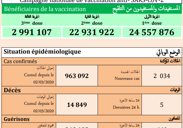 وأبرزت الوزارة في النشرة اليومية لحصيلة (كوفيد-19)، أن مليونين و991 ألف و107 شخصا تلقوا الجرعة الثالثة من اللقاح المضاد للفيروس، فيما ارتفع عدد الملقحين بالجرعة الثانية إلى 22 مليون و931 ألف و922 شخصا، مقابل 24 مليون و557 ألف و876 شخصا تلقوا الجرعة الأولى.